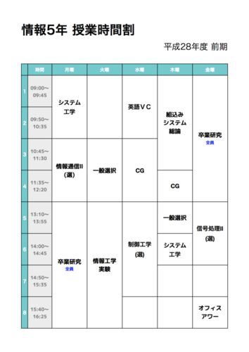 5年生が始まって1週間が経った。 おにぎりくんです。 pic.twitter.com/y8OANvtNS0 — mktakuya (@mktakuya) 2016年4月8日 授業 時間割はこんな感じ。 英語ⅤCと一般選択はTOEICで単位認定して授業消したし、信号処理Ⅱはそもそも履修していないので、火曜日は午…