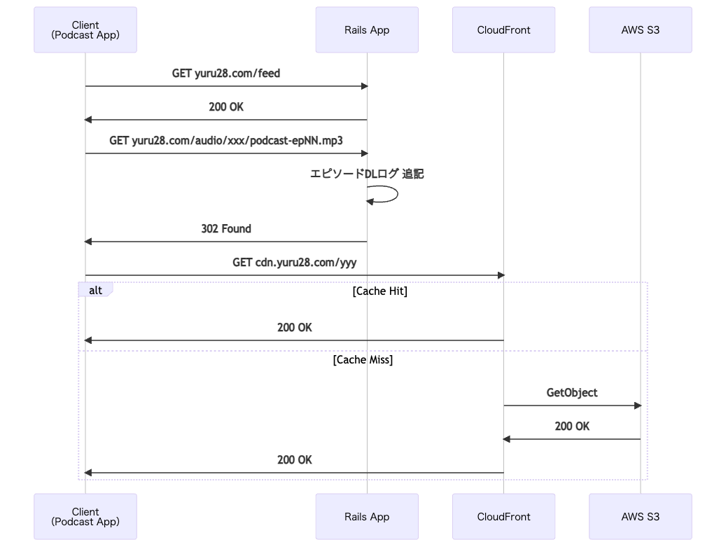 自作の配信システムの概要はこうだ。下図で示したのは音声配信の仕組みのみだが、WebサイトやPodcast CMS(Vue製のSPA)向けのAPIも同じRails Appに同居している。